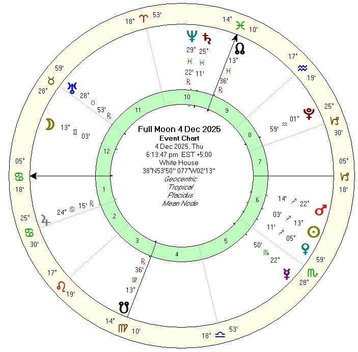 The Full Moon today at 13 Gemini brings revelation of matters which will shift the perception of the nation as well as impact on the nation’s image and public perception. The lunation falls within a degree of the USA Sibley chart’s Descendant at 12 Gemini.
